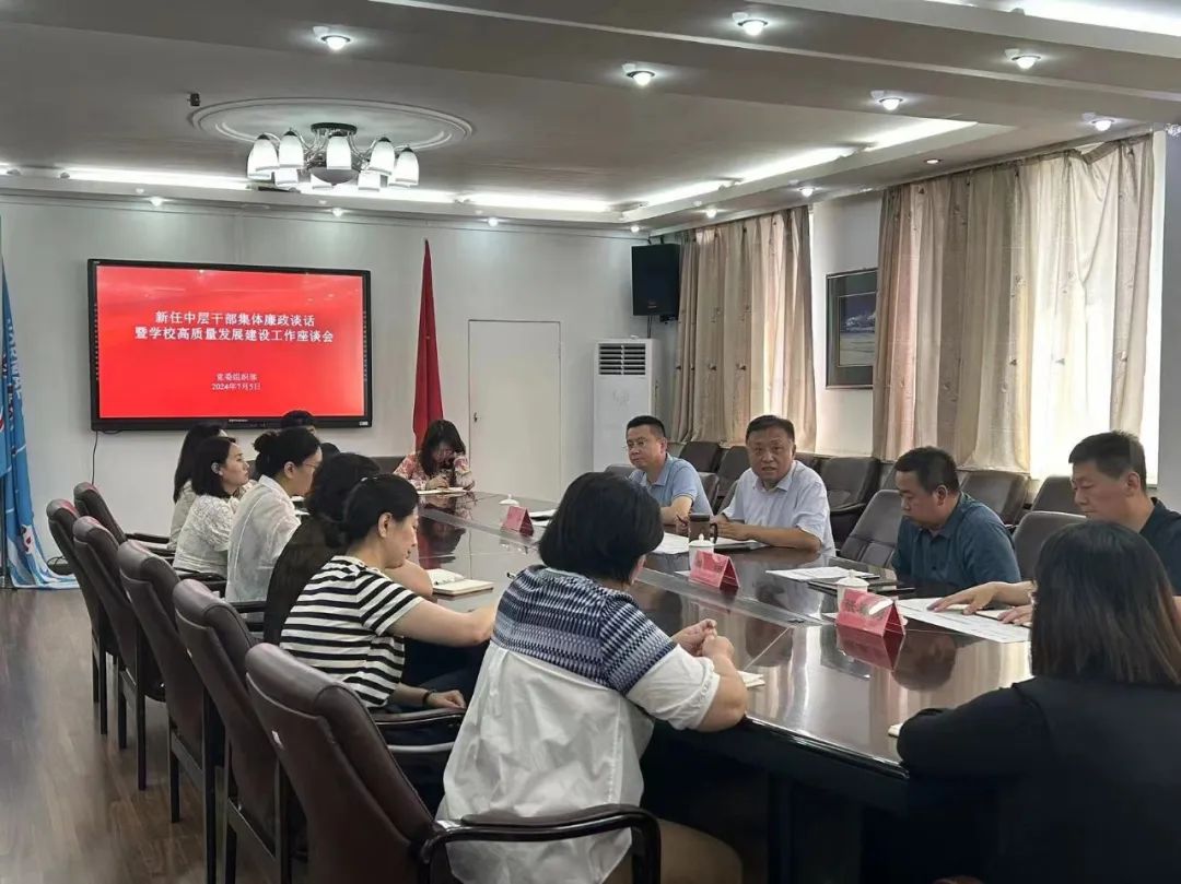 为进一步加强党纪学习教育,强化对新任职干部的管理、教育和监督,促进新任职干部廉洁自律、正确履职,7月5日,学校召开新任中层干部集体廉政谈话暨学校高质量发展建设工作座谈会。