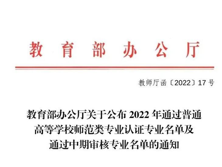 近日,教育部办公厅下发《教育部办公厅关于公布2022年通过普通高等师范类专业认证专业名单及通过中期审核专业名单的通知》(教师厅函〔2022〕17号)