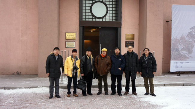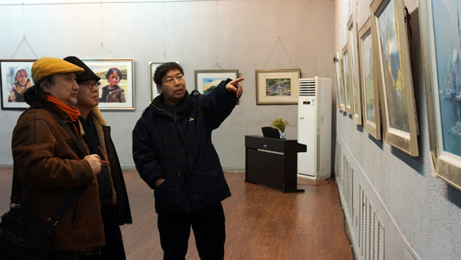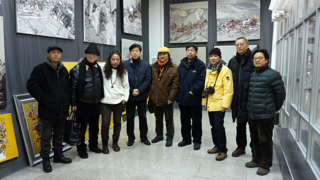 专家们在美术学院院长周晨辉的陪同下参观了学校里仁美术馆绘画作品展